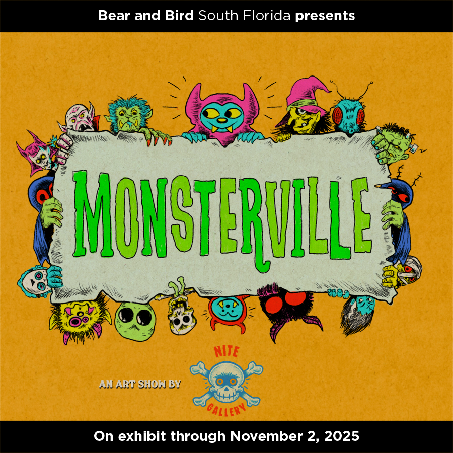 Monsterville is an idea that’s been rolling around in my brain for a while. Some of my favorite books growing up were Halloween search-and-find books and Dr. Seuss’s There’s a Wocket in My Pocket. I used to love the artwork and all the little scenarios happening on each page. They inspired me to create this spooky yet lighthearted town. This art show introduces a few of its residents and highlights different locations favored by our spooky guide and friend—Batty!