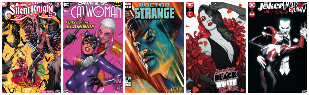 Batman – Santas Claus: Silent Knight #3; Catwoman #60; Doctor Strange #10; Harley Quinn: Black, White, & Redder #6; Joker/Harley Quinn: Uncovered #1