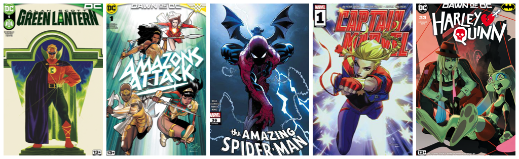 Alan Scott: Green Lantern #1; Amazons Attack #1; Amazing Spider-Man #36; Captain Marvel #1; Harley Quinn #33