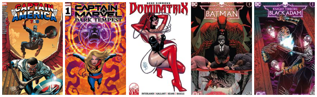 Captain America #750; Captain Marvel: Dark Tempest #1; Gene Simmons Dominatrix #1; Knight Terrors Batman #1; Knight Terrors Black Adam #1