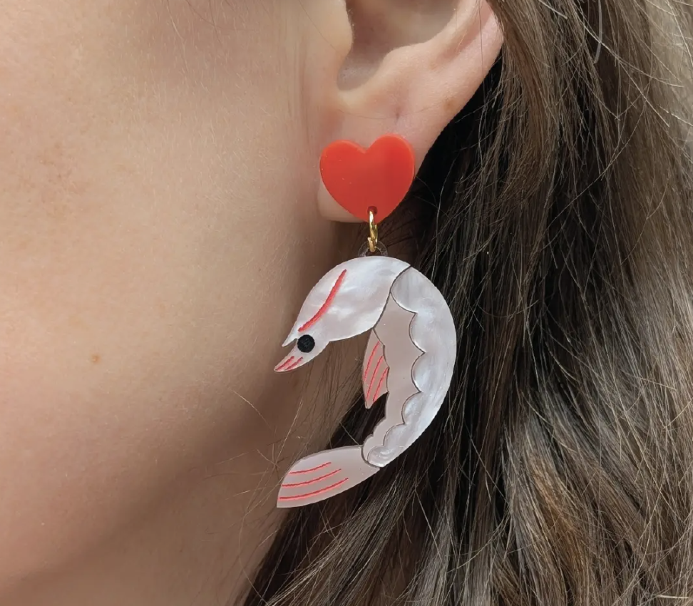 Add a little love (and a lot of personality) to your jewelry collection! These pearlescent laser-cut shrimp earrings feature an adorable dangling shrimp paired with a sweet heart stud for the perfect mix of quirky and cute. Or, if hearts aren’t your thing, pick the “earring hook” option for a more understated look.