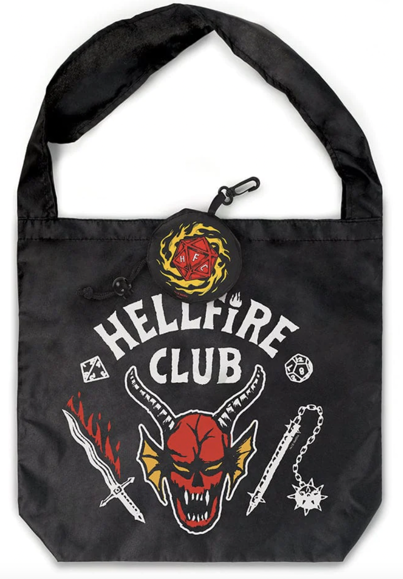 Show off your club colors wherever you go with Netflix’s Stranger Things Hellfire Club reusable graphic tote. This strong-but-lightweight tote folds up into a small printed pouch that clips to your belt, bike, or purse — so it’s easy to transport, even through different realms. Unfolds to a sizable 15.5 x 14 x 4″ with a 10″ long, extra-wide strap to comfortably carry your goods. Holds up to 12 pounds or 2 plastic grocery bags worth of stuff! Machine-washable pongee fabric. Hang to dry.