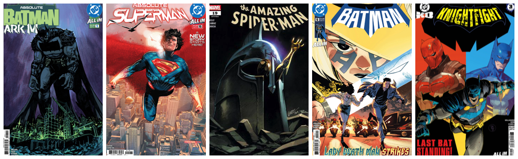 Absolute Batman Ark M #1; Absolute Superman #15; Amazing Spider-Man #19; Batman #5; DC KO Knightfight #3