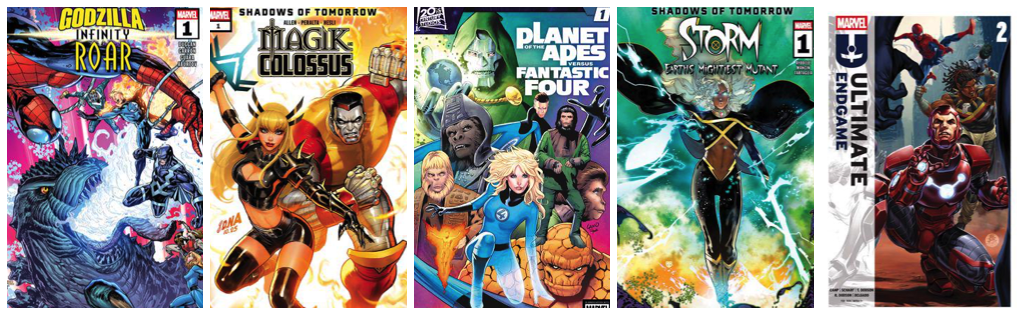 Godzilla: Infinity Roar #1; Planet of the Apes Vs. Fantastic Four #1; Magik & Colossus #1; Storm: Earth’s Mightiest Mutant #1; Ultimate Endgame #2