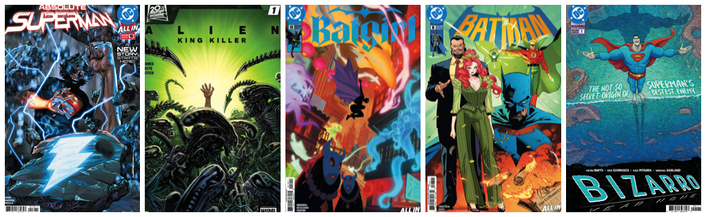Absolute Superman #18; Alien: King Killer #1; Batgirl #18; Batman #8; Bizarro: Year None #1