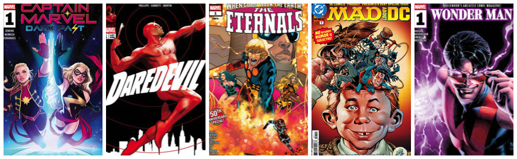 Captain Marvel: Dark Past #1; Daredevil #1; Eternals 50th Anniversary Special #1; Mad About DC #1; Wonder Man #1
